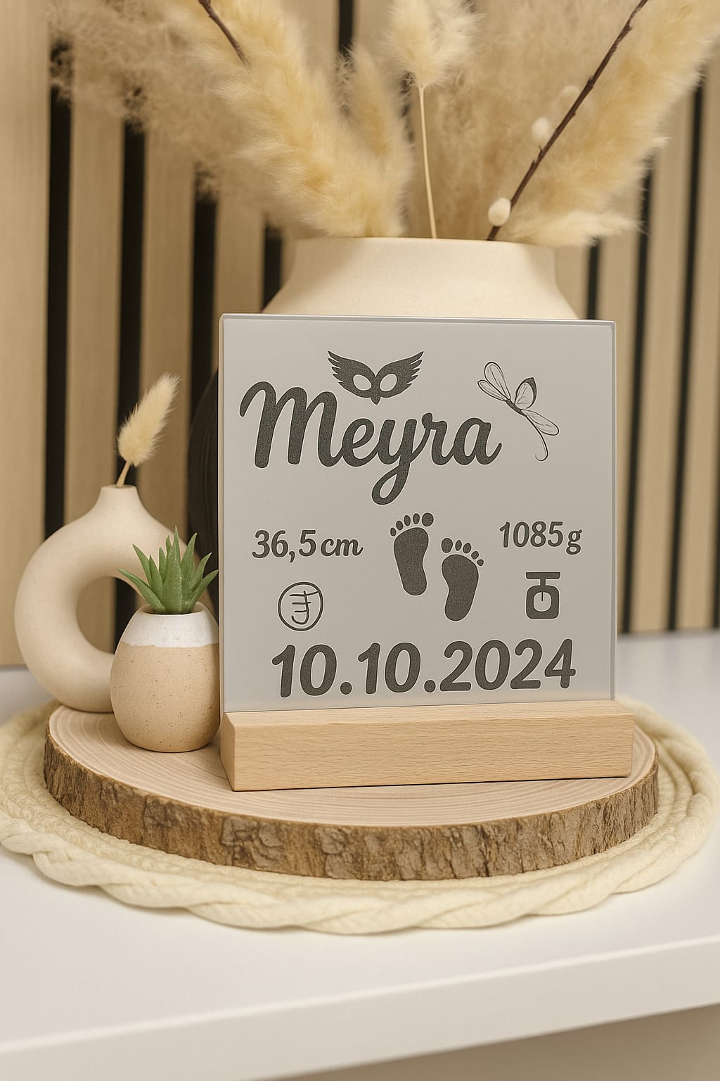 Unser personalisierbarer Premium-Spiegel vereint feine Gravurkunst mit moderner Lichttechnologie. Jede Linie, jeder Name, jedes Motiv wird präzise eingraviert und durch den kabelgebundenen LED-Holzsockel in sanft wechselnden Farben zum Leben erweckt.